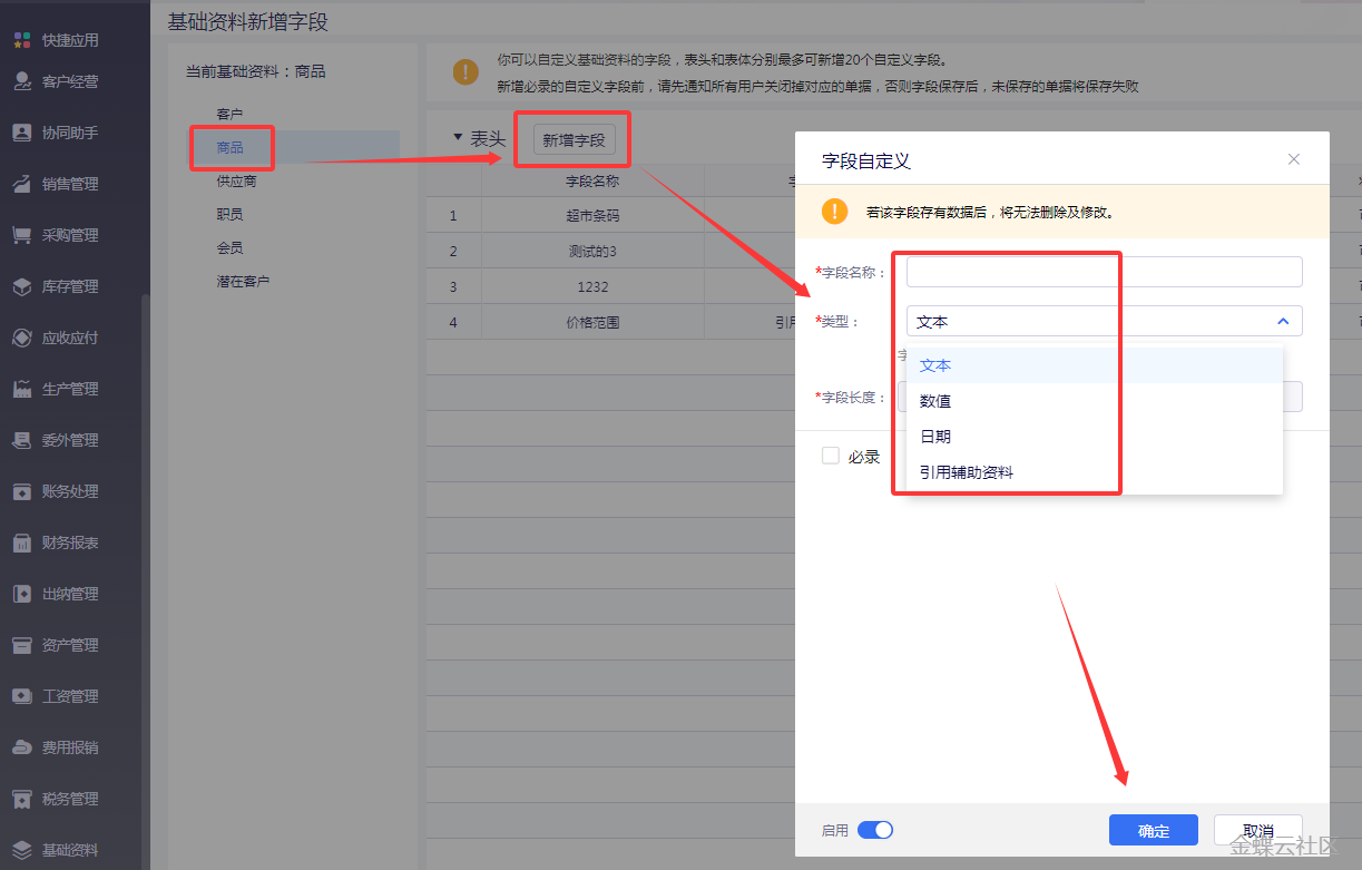 【操作流程】(1)设置商品的自定义字段:依次点击【系统设置】-【基础资料新增字段】-【商品】,点击左上角【新增字段】,如新增一个名称为“商品自定义字段“字段,文本类型,非必录项(2)在商品中维护自定义字段的相关信息:依次点击【基础资料】-【商品信息】新增或编辑商品资料,维护自定义字段信息(3)在单据中设置自定义字段信息:【系统参数】-【单据新增字段】,选择左边对应单据,如选择“销售订单”,点击中间“新增表体字段”,设置字段名称为”订单自定义字段“(名称可以自由设置),类型选择”带出已有基础资料属性“值来源选择“商品”“商品自定义字段”点击确定保存即可(4)录入销售订单时可以带出这个商品的字段信息