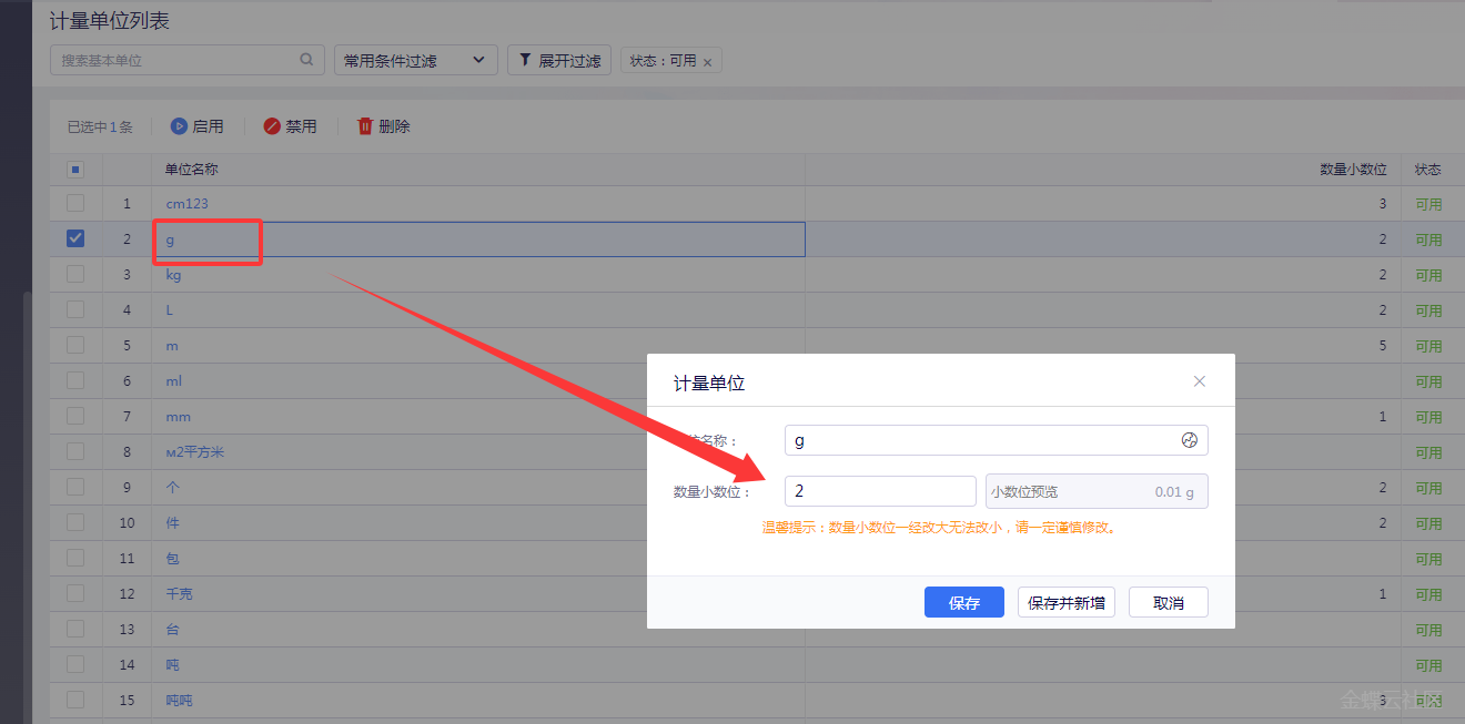 【操作流程】(1)数量小数位数设置:依次点击【基础资料】-【计量单位】,在编辑计量单位时即可设置数量的小数位数;(2)、单价小数位数设置:依次点击【基础资料】-【币别】,在编辑币别资料时设置单价的小数位数。【注意】数量和单价的小数位数一经改大无法改小,请一定谨慎修改。