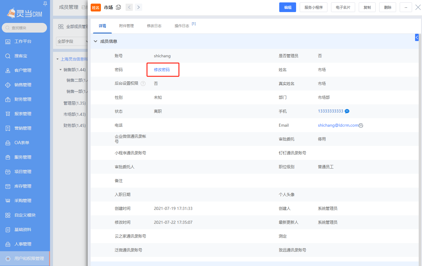 系统管理员可修改所有成员的密码,只需到用户管理中,编辑成员信息,就能修改密码。每个成员也可以修改自己的密码,在系统右上角头像处进入【个人设置】,点击编辑,即可修改自己的登录密码,修改完毕后系统会要求重新登录。如果忘记了密码,在登录页面点击找回密码,能通过该账号用户信息里的邮箱 验证码的方式将密码重置,然后再用新密码登录即可。