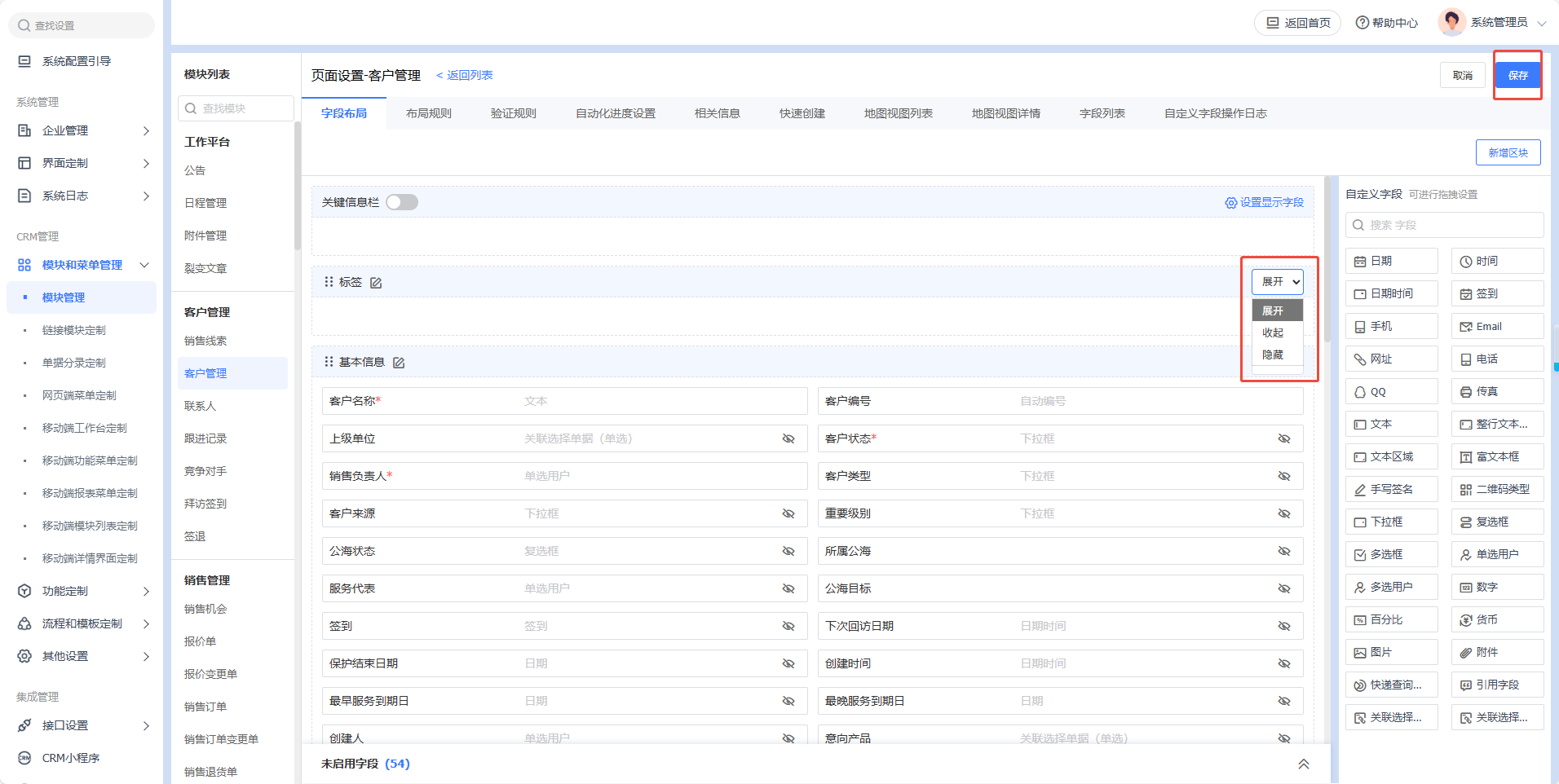 后台设置-模块和企业管理-模块管理,选择模块,点击页面设置,把标签的功能开启。可以选择展开或收起。点击添加标签。