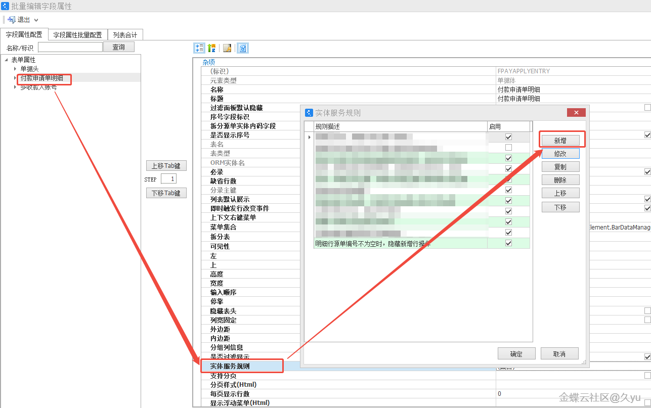 背景下推的单据付款申请单不允许新增行/复制行;但是直接新增的付款申请单必须允许明细进行新增行/复制行操作,该如何设置?核心要点下推生成的付款申请单有源单编号字段,而直接新增的付款申请单没有源单编号。对此,在BOS中我们可以通过设置实体服务规则来控制菜单可见性,从而控制新增行菜单按钮是否可用。操作步骤最终操作如下:效果展示直接新增付款申请单,源单编号为空时,由上游单据下推生成时,