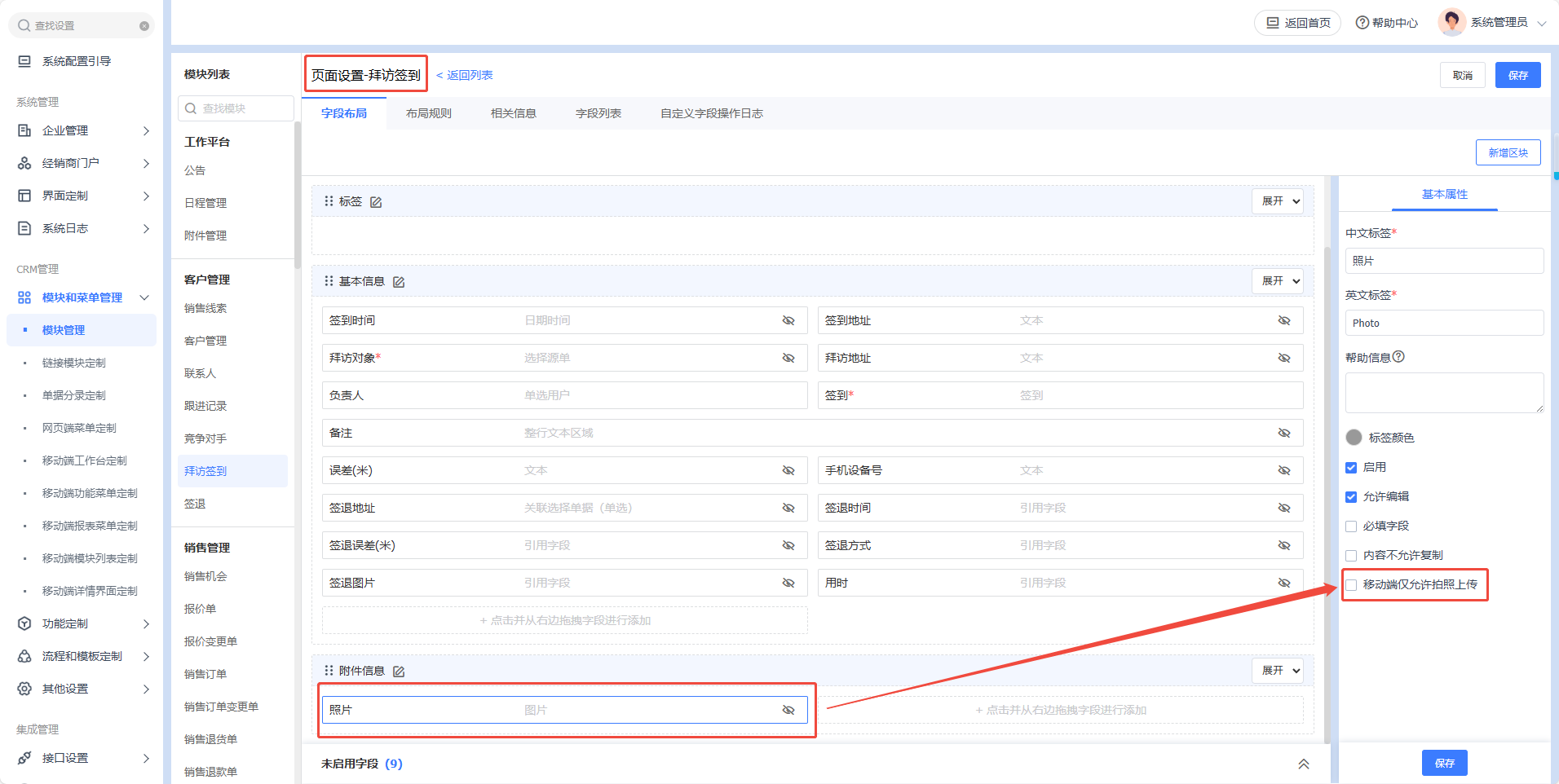 打开后台设置,找到“拜访签到”模块,点击页面设置。点击“照片”字段的编辑按钮,勾选“移动端仅允许拍照上传”即可。