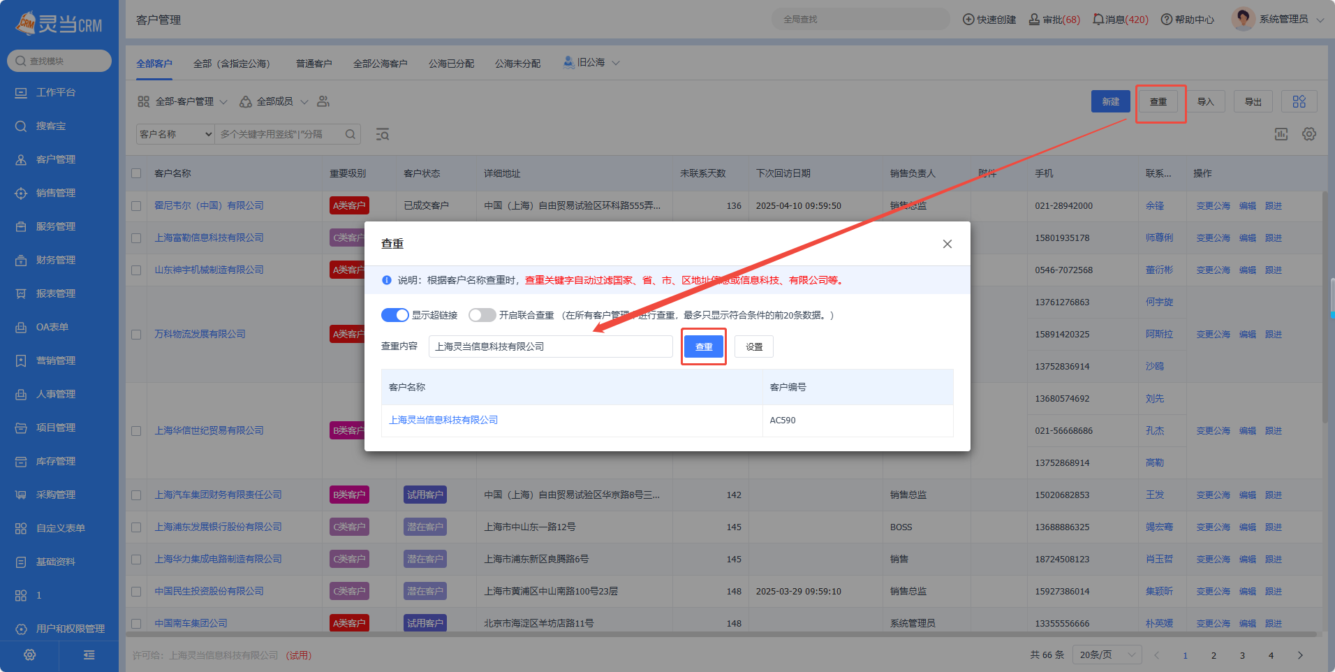 进入客户管理界面,右侧点击“查重”按钮,输入需要查重的信息。点击“立即查重”。无搜索结果即为数据不重复,有搜索结果(如图中所示)即为数据重复。