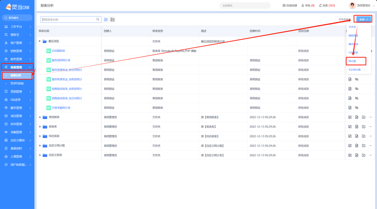 打开报表分析,点击右上角新建,新建统计图选择合适的图标,根据自身需求进行自定义,点击设为看板组件即可